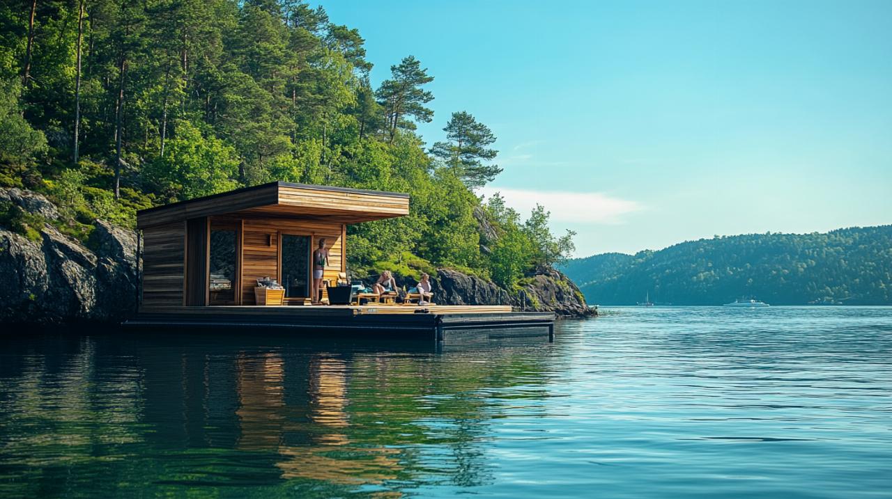 Relaxation nordique dans un sauna flottant sur le fjord